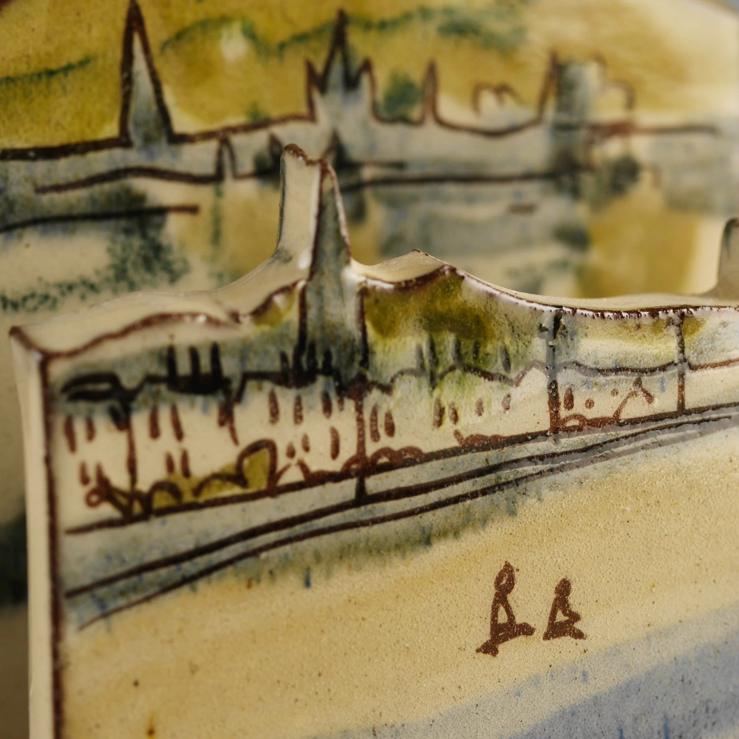 Slab built with cut out silhouettes of chicken. Decorated with sgraffito and coloured slips and glazes.