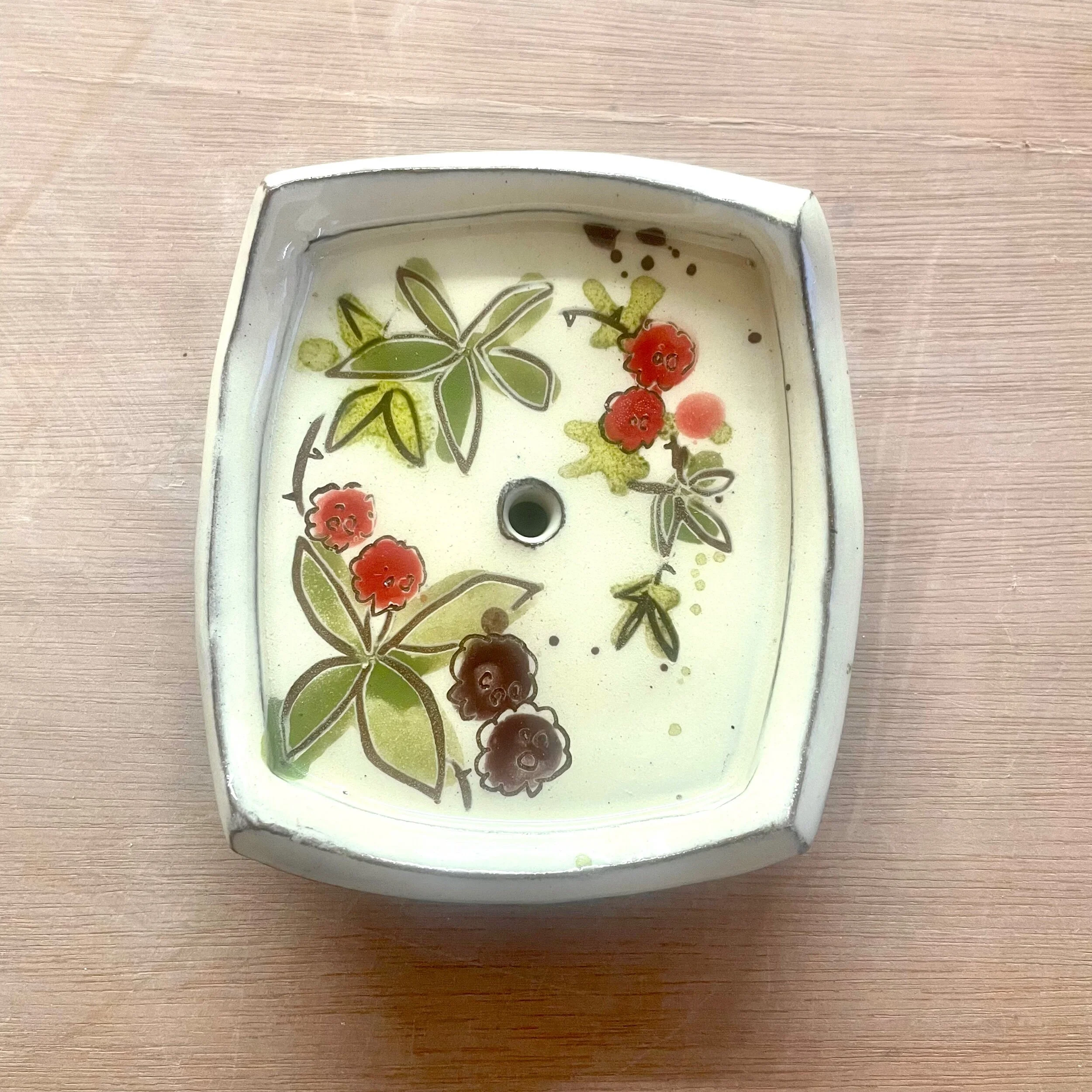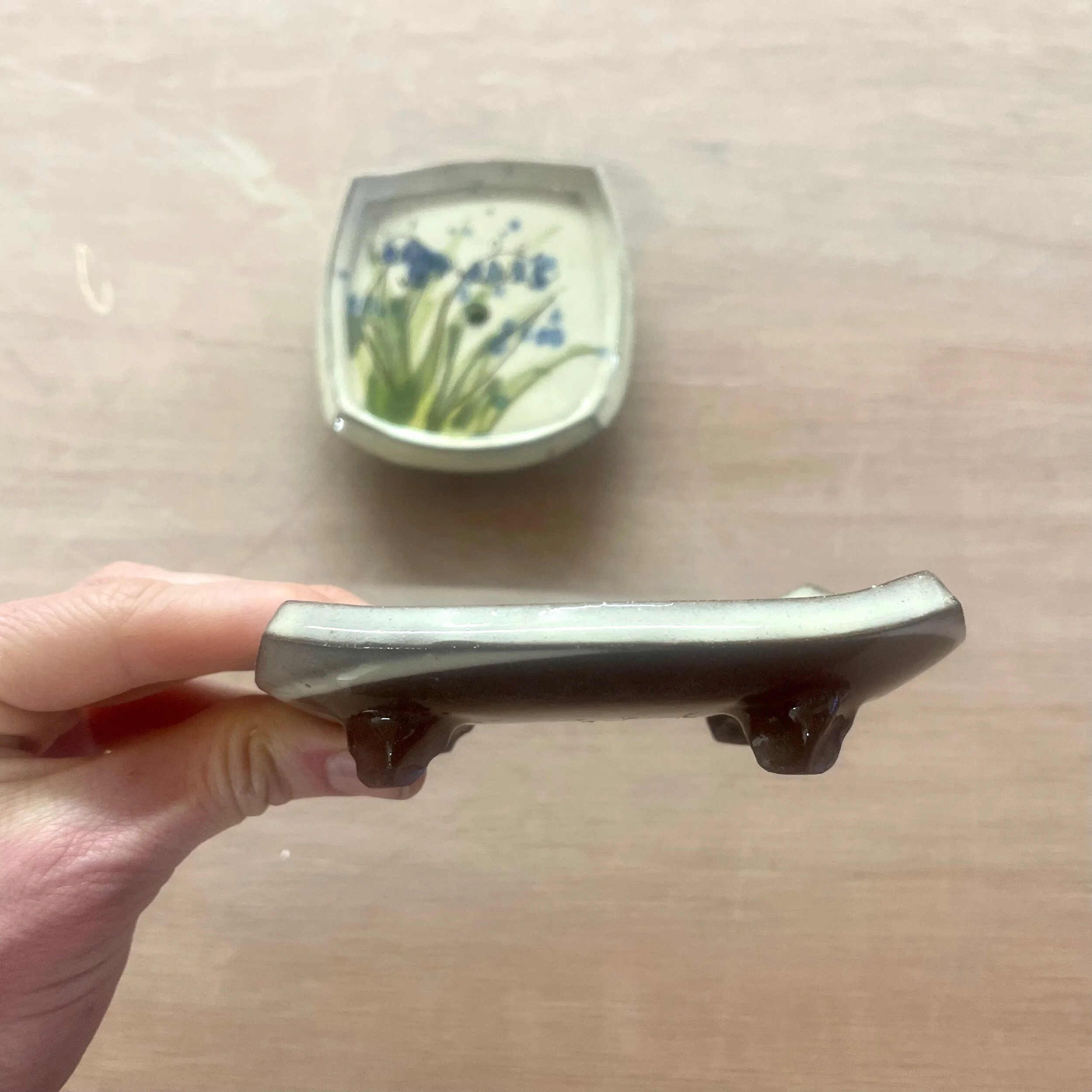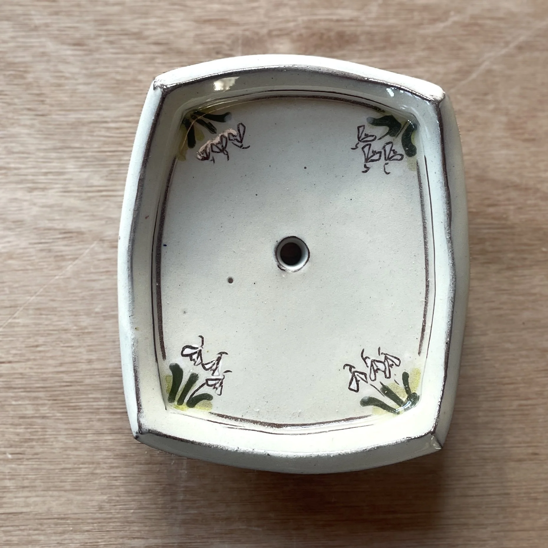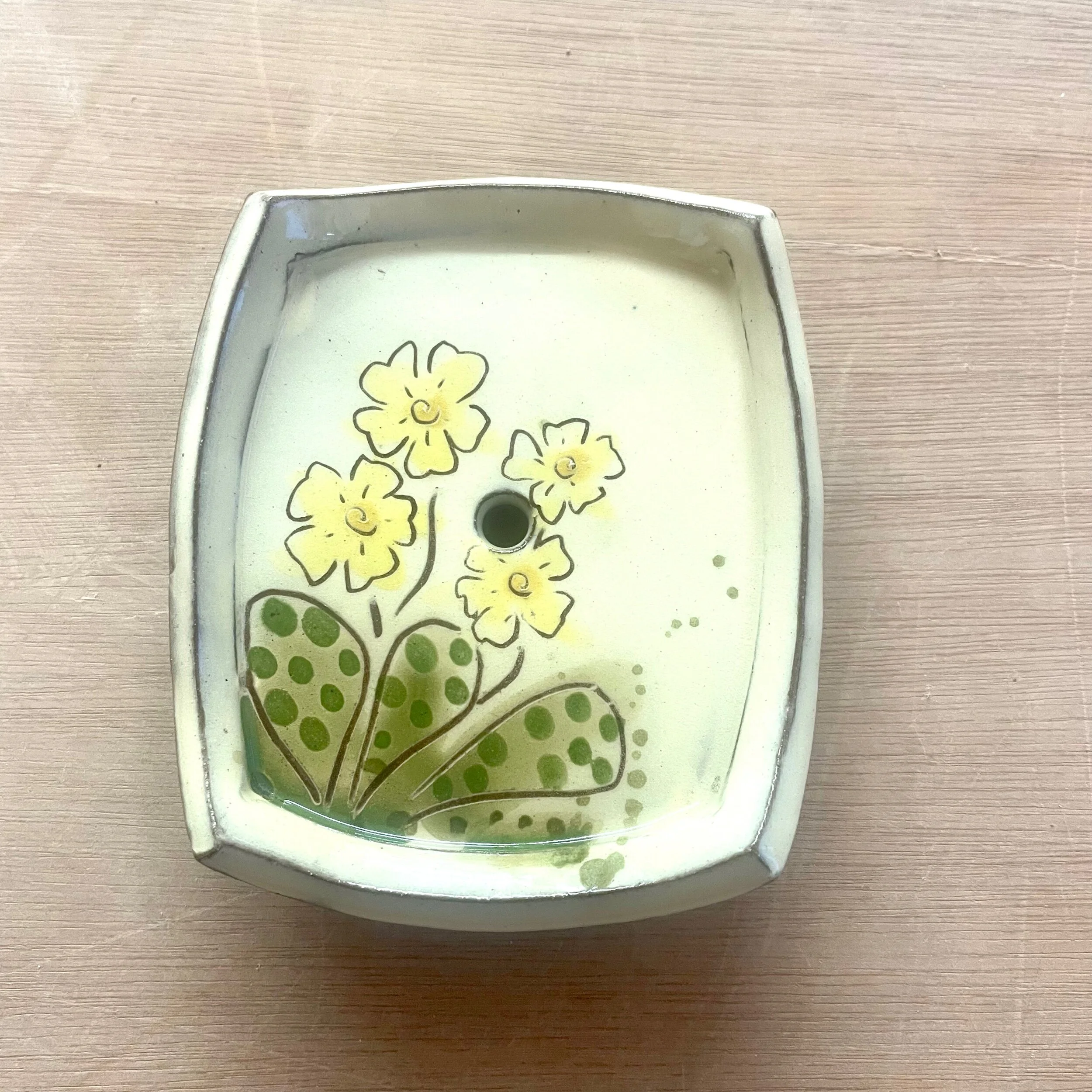 A curved rectangular slab with 4 little feet. Fits a pat of butter. 14cm x11.5cm x 2cm
